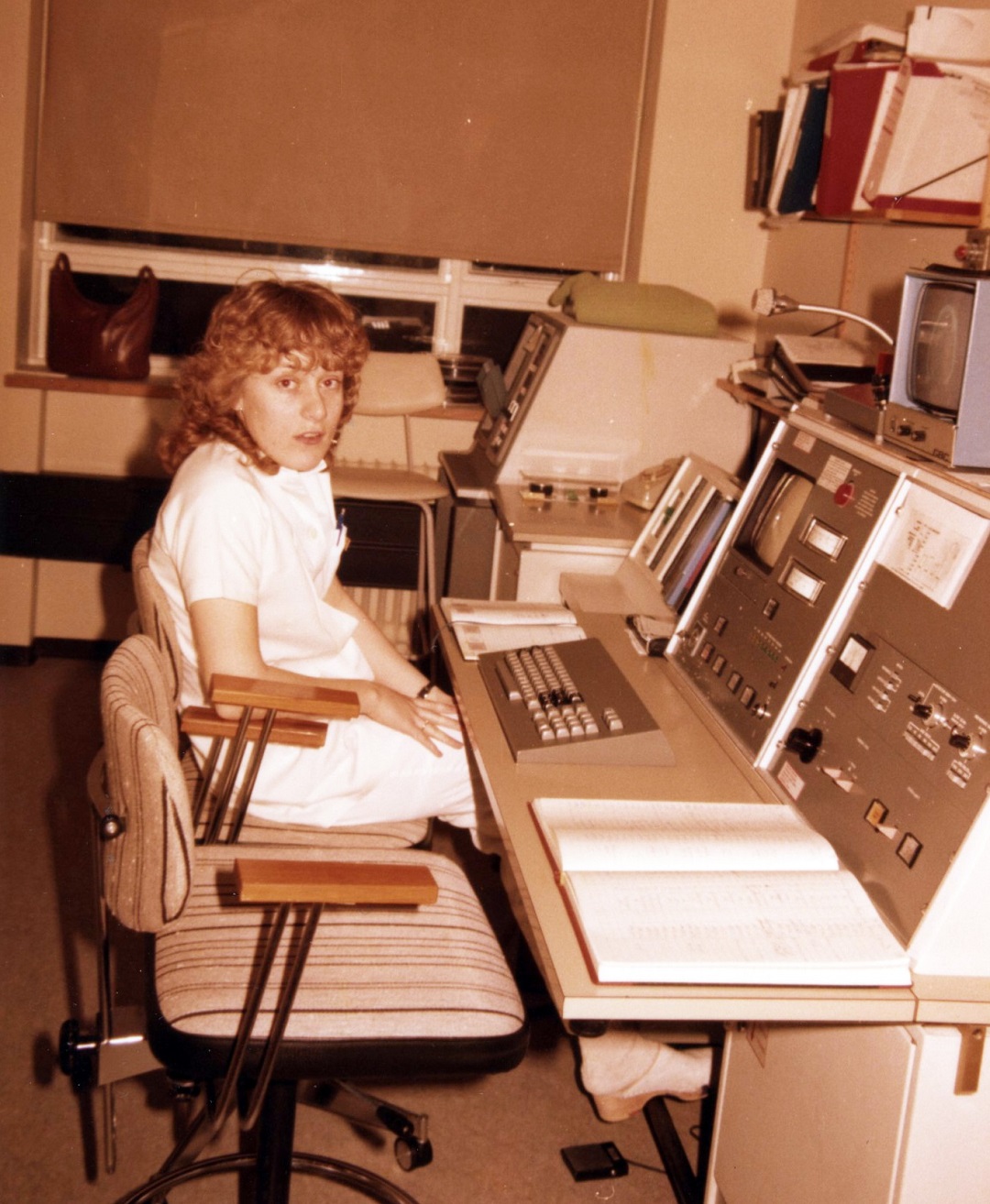 - Hér má sjá Ástu Ástþórsdóttur, geislafræðing, við stjórnborð fyrsta CT tækisins. Mynd Ingibjörg R. Guðjónsdóttir.