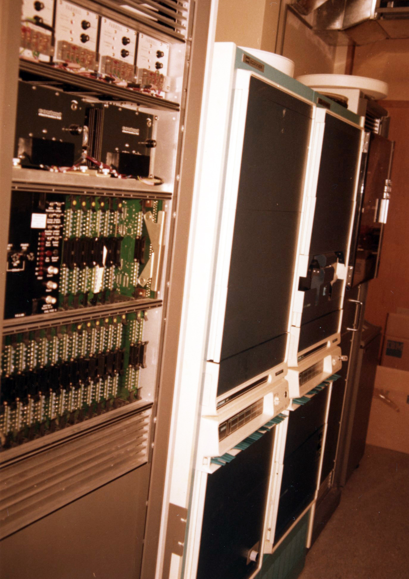 - Tölvubúnaður að baki fyrsta CT tækinu. Næst er stjórnskápur fyrir gantry og til hægri eru tvær tölvur, hvor um sig með 5 MB hörðum diski og 32 k minni. Mynd: Kolbrún Kjartansdóttir.
