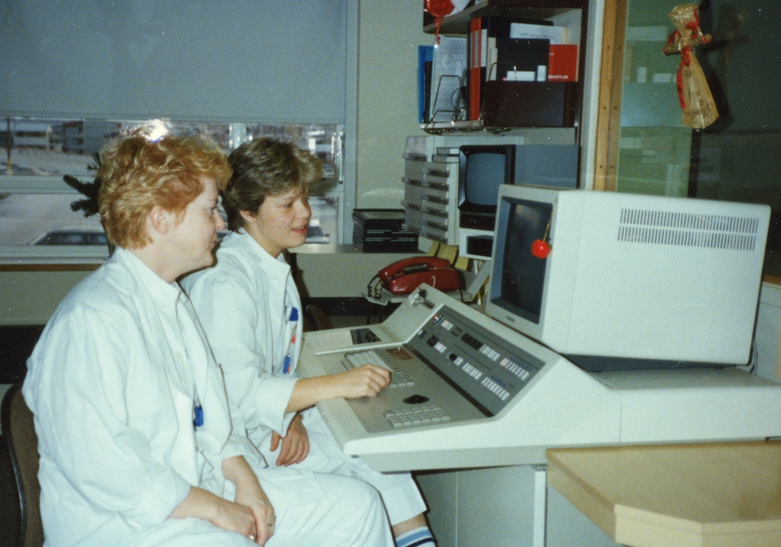 - Þarna er komið árið 1988 og CT tæki nr. 2, Toshiba 600 S, tekið í notkun á BSP. Ingibjörg R. Guðjónsdóttir (Immý) og Grímheiður Jóhannsdóttir (Heiða) við stjórn. Mynd Ingibjörg R. Guðjónsdóttir.