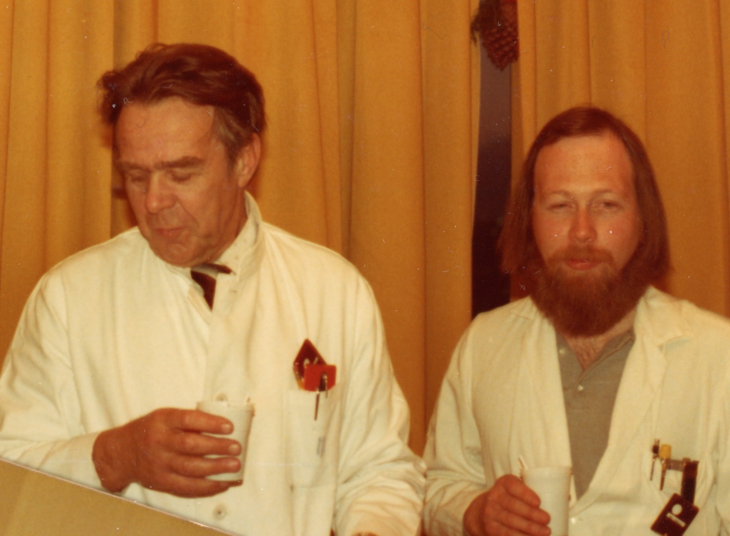 - Ásmundur Brekkan, yfirlæknir, og Smári Kristinsson í jólaboði rtg.deildar Borgarspítalans 1980. Mynd Ingibjörg R. Guðjónsdóttir.