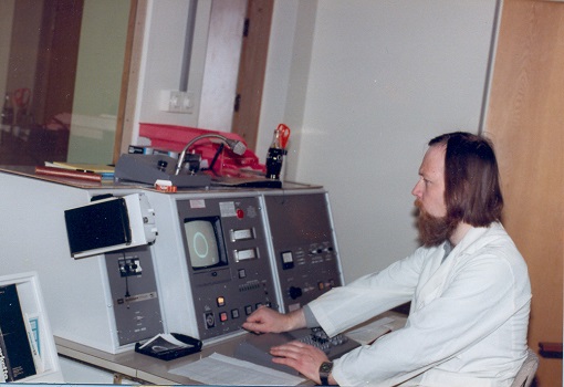 - Fyrsta CT á Íslandi kom á Borgarspítalann 1981. Hér situr Smári við stjórnborðið. Mynd Ingibjörg R. Guðjónsdóttir.